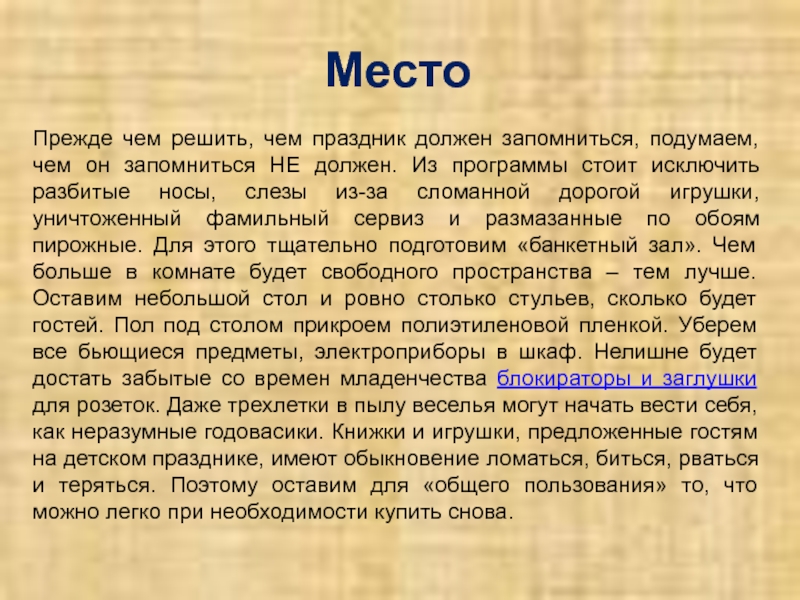 НЕ должен. Из программы стоит исключить разбитые носы, слезы из-за сломанной дорогой игрушки, уничтоженный фамильный сервиз и размазанные по обоям пирожные. Для этого тщательно подготовим «банкетный зал». Чем больше в комнате будет свободного пространства – тем лучше. Оставим небольшой стол и ровно столько стульев, сколько будет гостей. Пол под столом прикроем полиэтиленовой пленкой. Уберем все бьющиеся предметы, электроприборы в шкаф. Нелишне будет достать забытые со времен младенчества блокираторы и заглушки для розеток. Даже трехлетки в пылу веселья могут начать вести себя, как неразумные годовасики. Книжки и игрушки, предложенные гостям на детском празднике, имеют обыкновение ломаться, биться, рваться и теряться. Поэтому оставим для «общего пользования» то, что можно легко при необходимости купить снова.