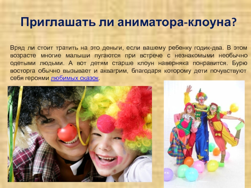 ребенку годик-два. В этом возрасте многие малыши пугаются при встрече с незнакомыми необычно одетыми людьми. А вот детям старше клоун наверняка понравится. Бурю восторга обычно вызывает и аквагрим, благодаря которому дети почувствуют себя героями любимых сказок.