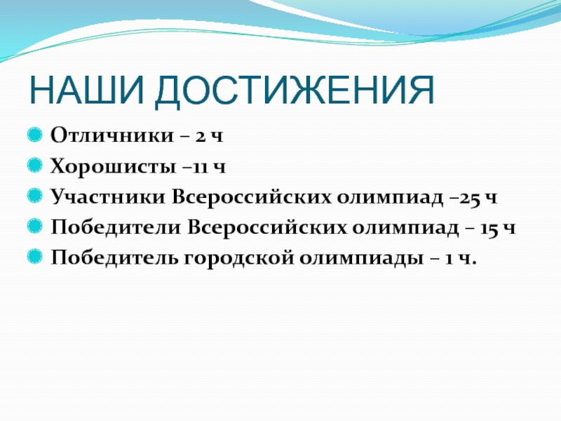 НАШИ ДОСТИЖЕНИЯОтличники – 2 чХорошисты –11 чУчастники Всероссийских олимпиад –25 чПобедители Всероссийских олимпиад – 15 чПобедитель городской