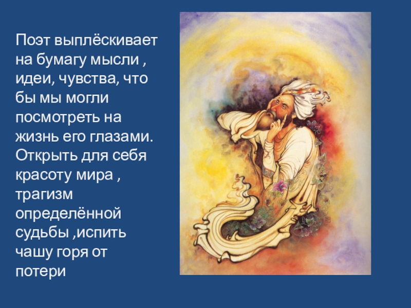Слайд 5Поэт выплёскивает на бумагу мысли ,идеи, чувства, что бы мы могли