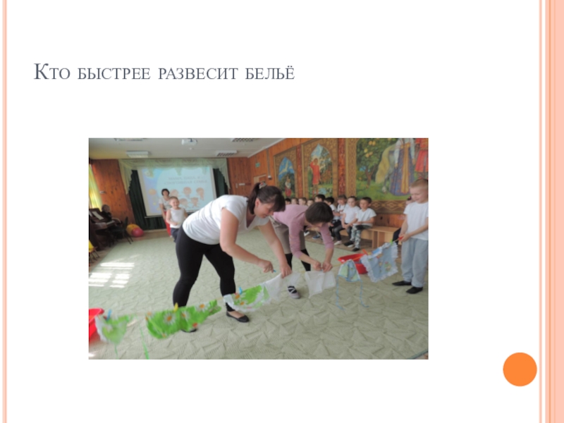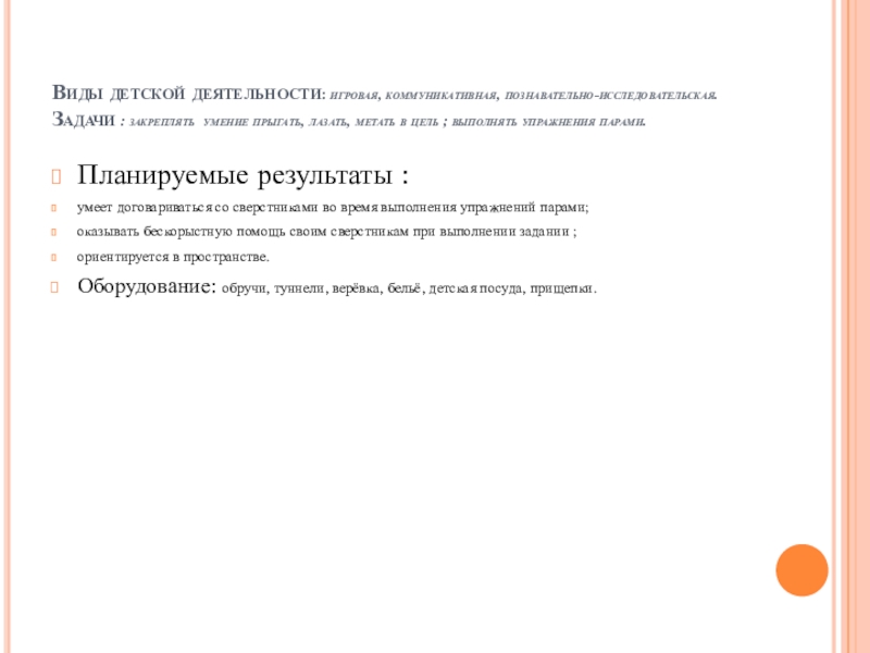 Оборудование: обручи, туннели, верёвка, бельё, детская посуда, прищепки.