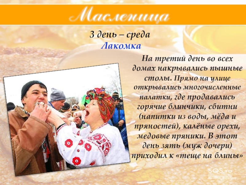 пышные столы. Прямо на улице открывались многочисленные палатки, где продавались горячие блинчики, сбитни (напитки из воды, мёда и пряностей), калёные орехи, медовые пряники. В этот день зять (муж дочери) приходил к «теще на блины»