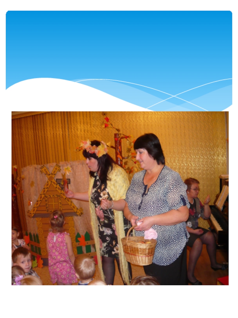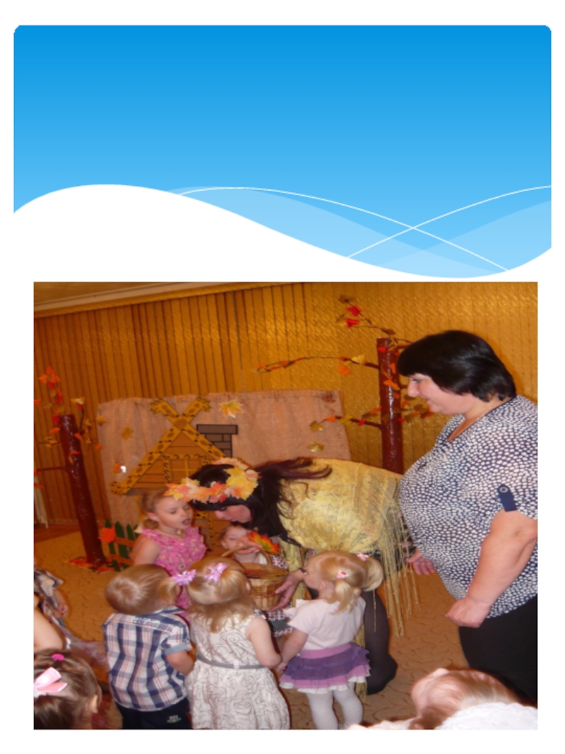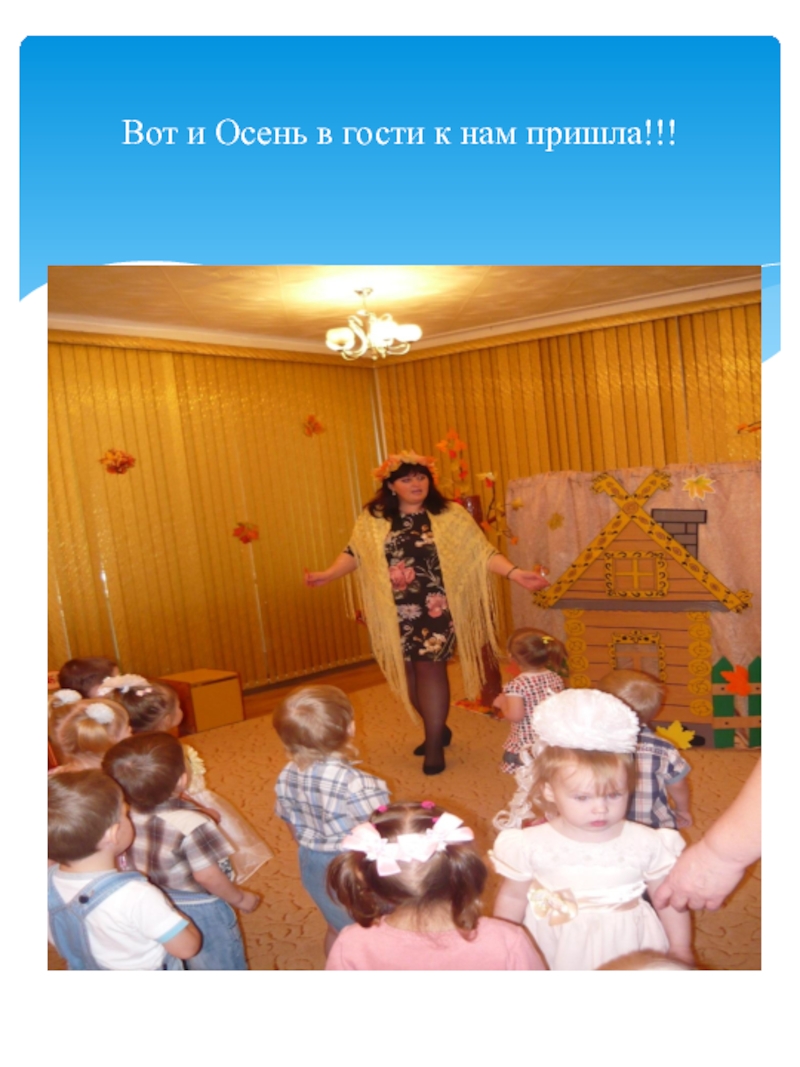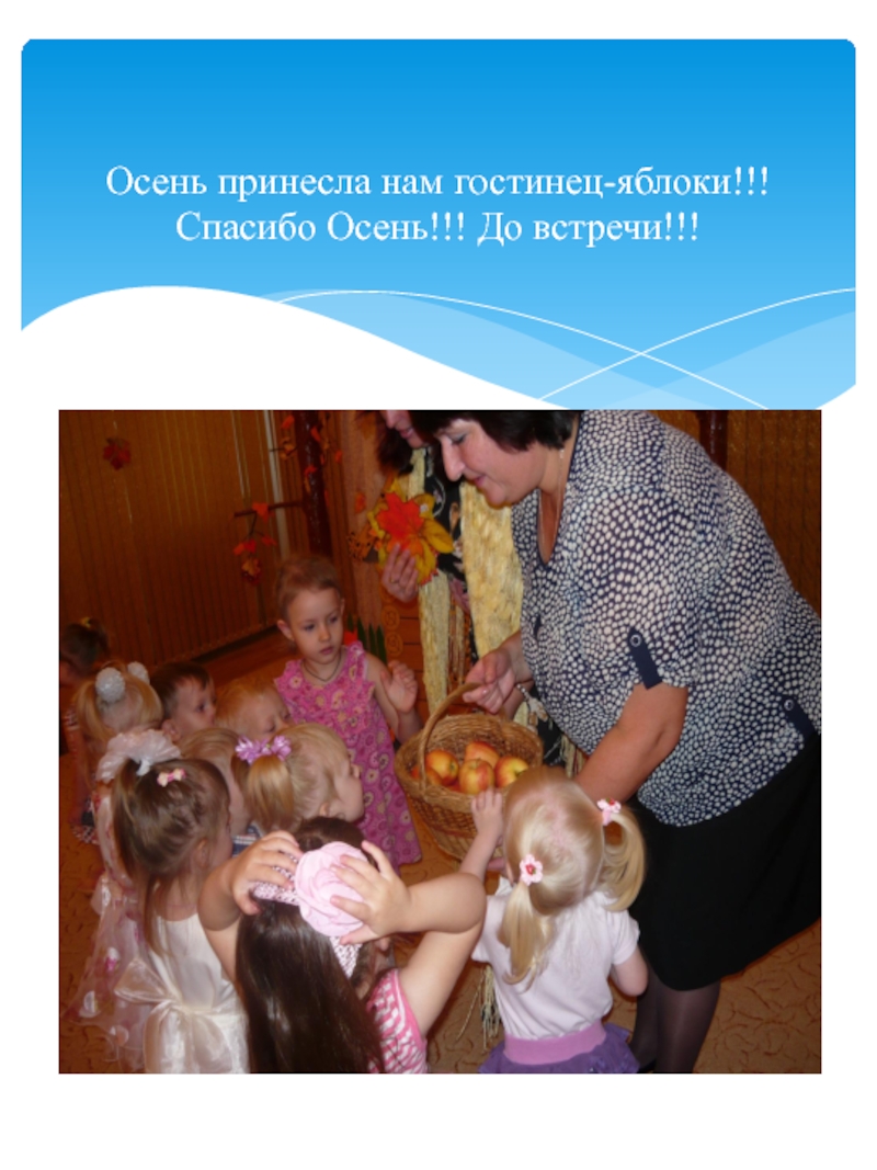 нее говорят: золотая осень! Все деревья вокруг: и в садах, и во дворах и в лесу стоят нарядные, словно ждут праздника. Хозяйка осень приносит нам самые главные свои подарки это урожай хлеба, овощей и фруктов. Вот и мы со своими малышами встретили эту затейницу осень.