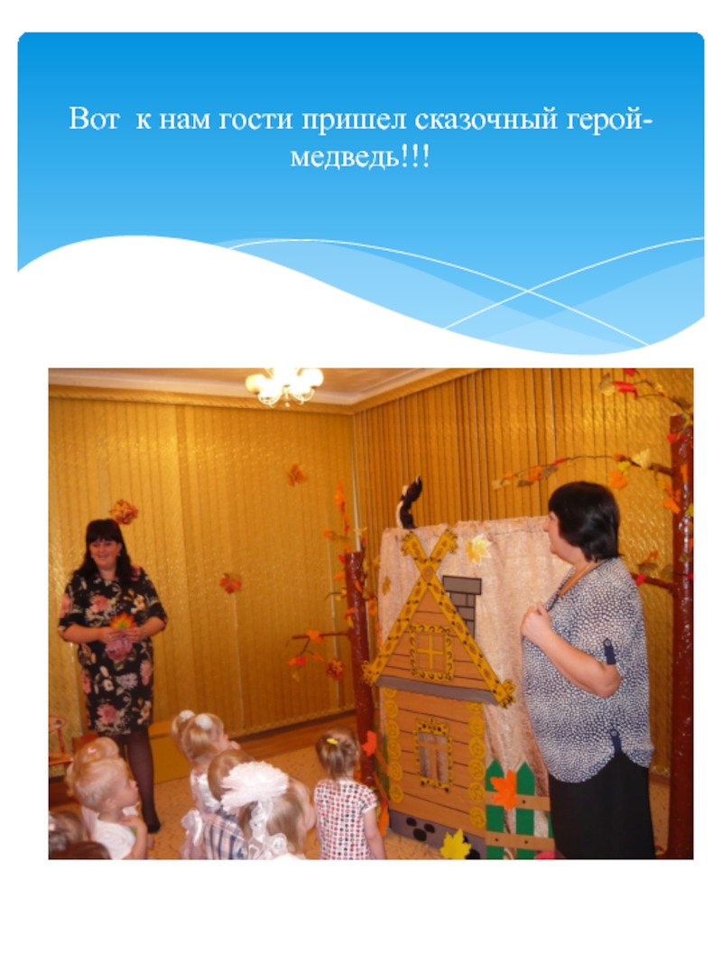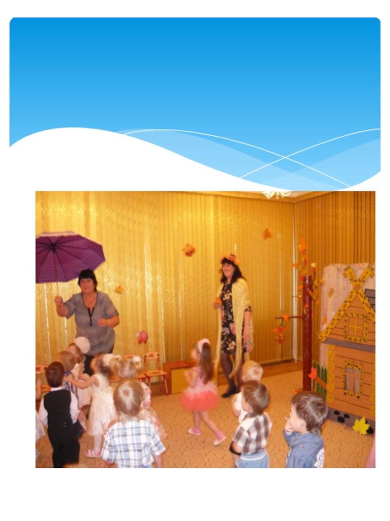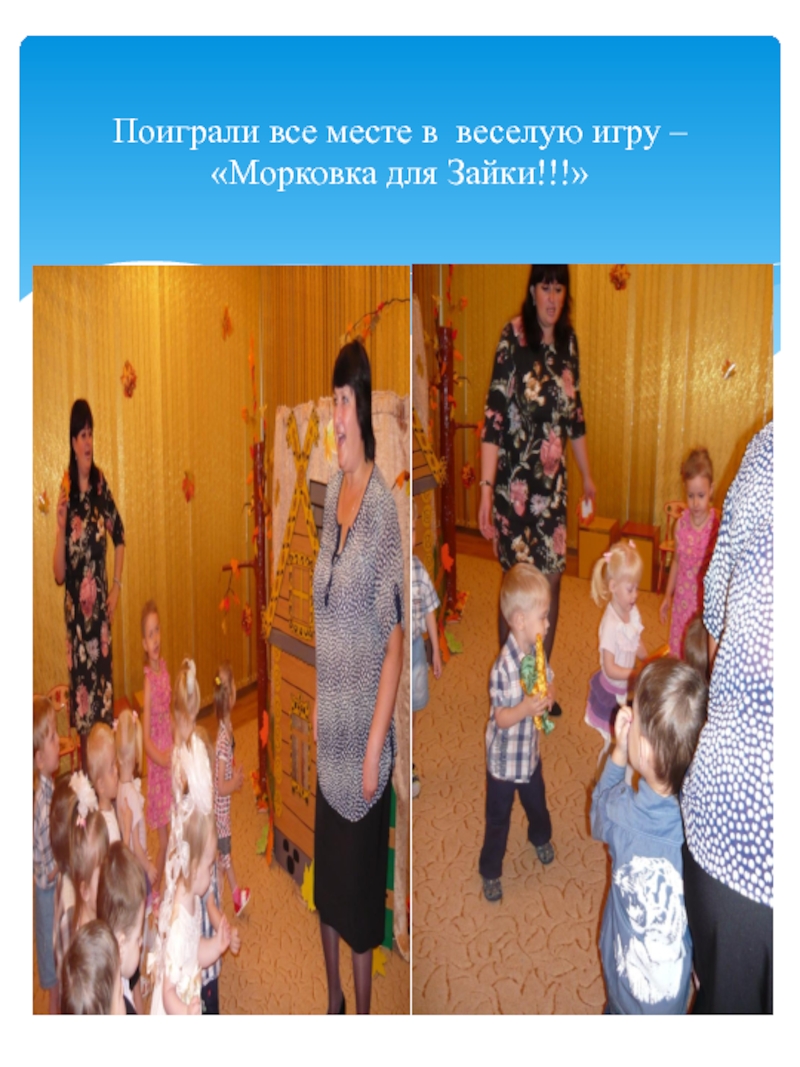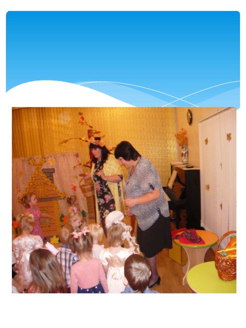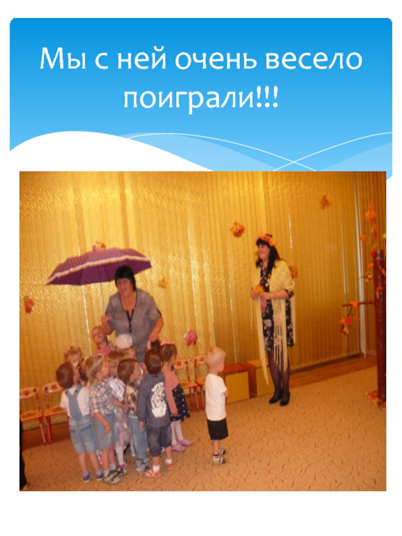 нее говорят: золотая осень! Все деревья вокруг: и в садах, и во дворах и в лесу стоят нарядные, словно ждут праздника. Хозяйка осень приносит нам самые главные свои подарки это урожай хлеба, овощей и фруктов. Вот и мы со своими малышами встретили эту затейницу осень.