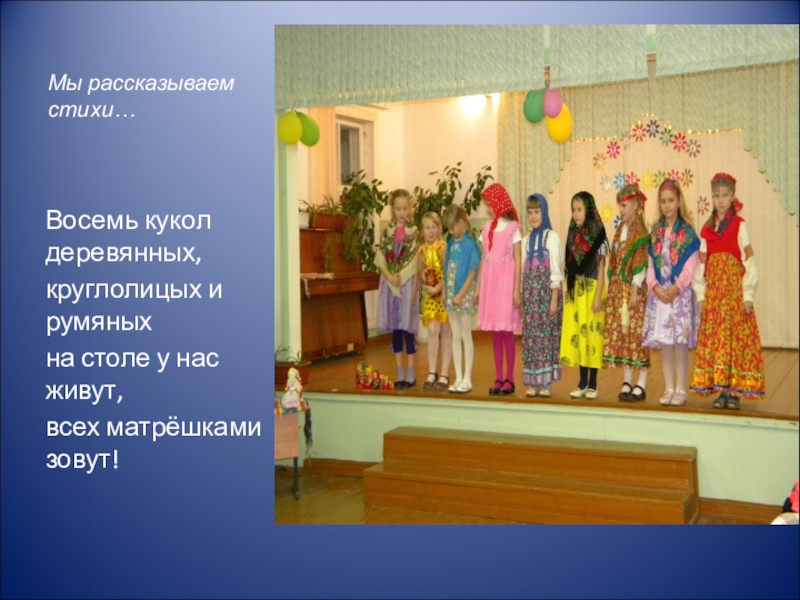 Мы рассказываем стихи…Восемь кукол деревянных,круглолицых и румяныхна столе у нас живут,всех матрёшками зовут!