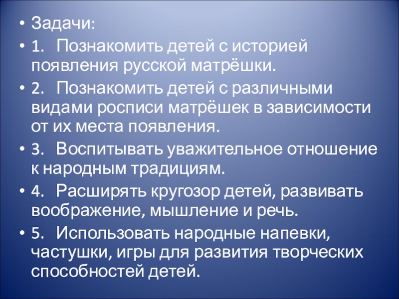 Задачи:1.	Познакомить детей с историей появления русской матрёшки.2.	Познакомить детей с различными видами росписи матрёшек в зависимости от их
