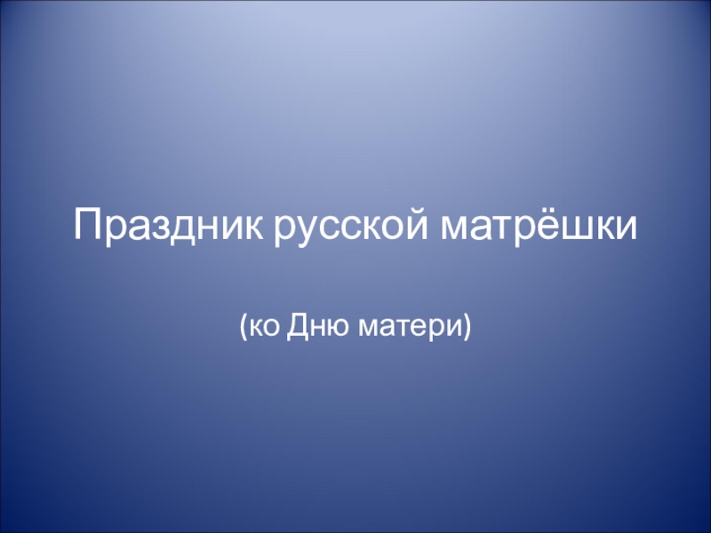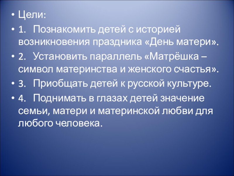 Цели:1. Познакомить детей с историей возникновения праздника «День матери».2. Установить параллель «Матрёшка – символ материнства и женского счастья».3. Приобщать детей к русской культуре.4. Поднимать в глазах детей значение семьи, матери и материнской любви для любого человека.