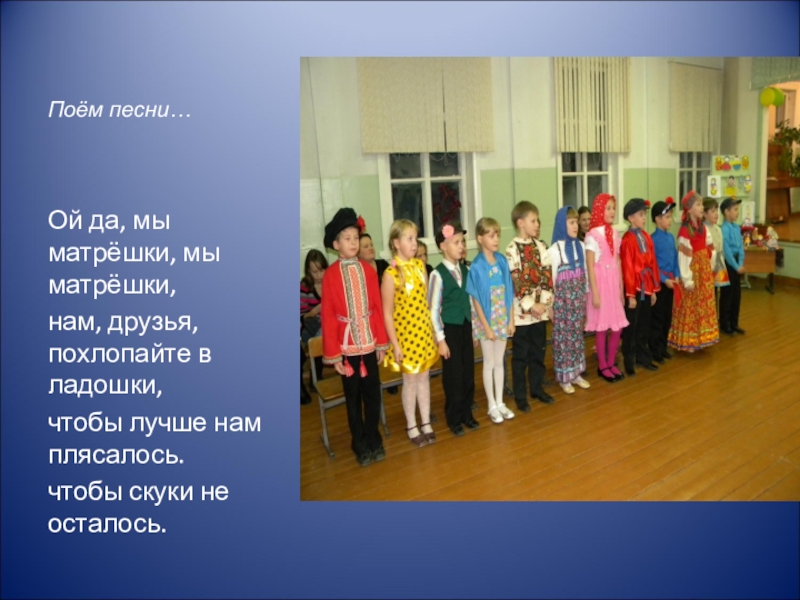 Поём песни…Ой да, мы матрёшки, мы матрёшки,нам, друзья, похлопайте в ладошки,чтобы лучше нам плясалось.чтобы скуки не осталось.