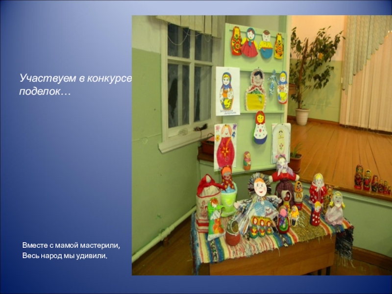 Участвуем в конкурсе поделок…Вместе с мамой мастерили,Весь народ мы удивили.