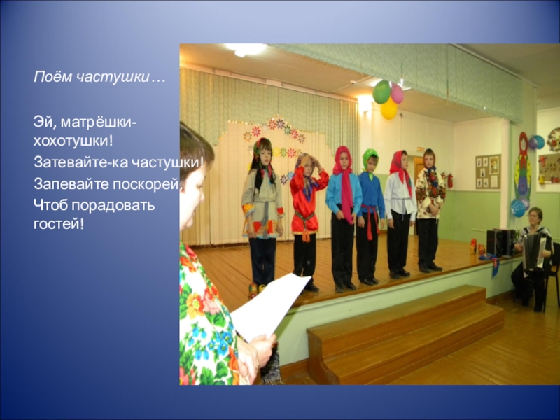 Поём частушки…Эй, матрёшки-хохотушки!Затевайте-ка частушки!Запевайте поскорей,Чтоб порадовать гостей!