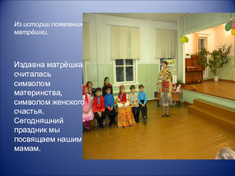 Из истории появления матрёшки.Издавна матрёшка считалась символом материнства, символом женского счастья. Сегодняшний праздник мы посвящаем нашим мамам.
