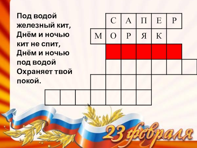 Слайд 10Под водой железный кит, Днём и ночью кит не спит, Днём и ночью