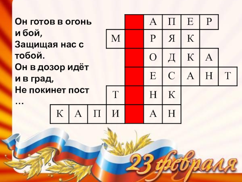 Слайд 18Он готов в огонь и бой, Защищая нас с тобой. Он в дозор
