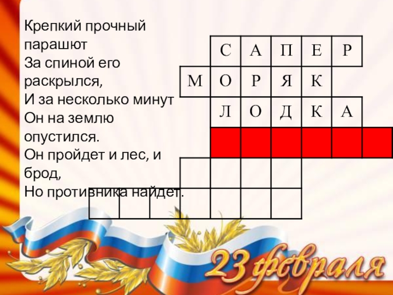 Крепкий прочный парашютЗа спиной его раскрылся,И за несколько минутОн на землю опустился.Он пройдет и лес, и брод,Но