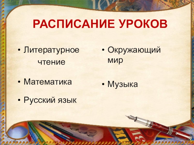 РАСПИСАНИЕ УРОКОВЛитературное     чтениеРусский языкМатематикаОкружающий мирМузыка