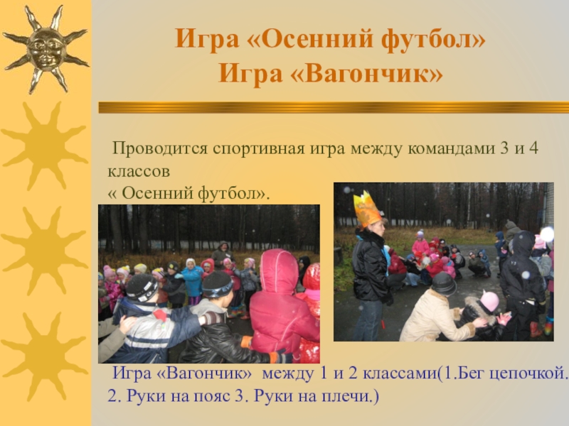 Игра «Осенний футбол»  Игра «Вагончик» Проводится спортивная игра между командами 3 и 4 классов « Осенний