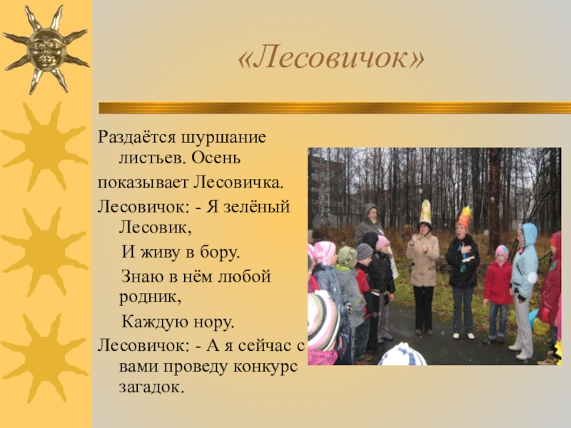 «Лесовичок»Раздаётся шуршание листьев. Осеньпоказывает Лесовичка.Лесовичок: - Я зелёный Лесовик,   И живу в бору.