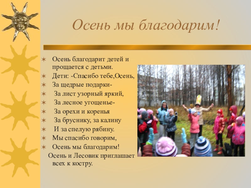 Осень мы благодарим!Осень благодарит детей и прощается с детьми.Дети: -Спасибо тебе,Осень,За щедрые подарки- За лист узорный яркий,