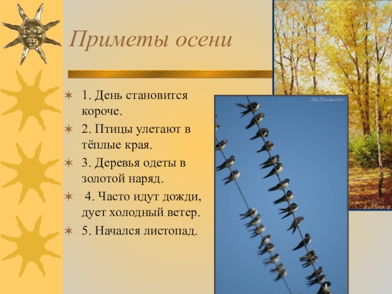 Приметы осени1. День становится короче.2. Птицы улетают в тёплые края.3. Деревья одеты в золотой наряд. 4. Часто