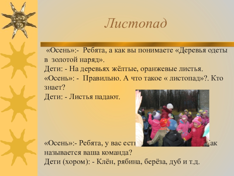 Листопад «Осень»:- Ребята, а как вы понимаете «Деревья одеты в золотой наряд». Дети: - На деревьях жёлтые,
