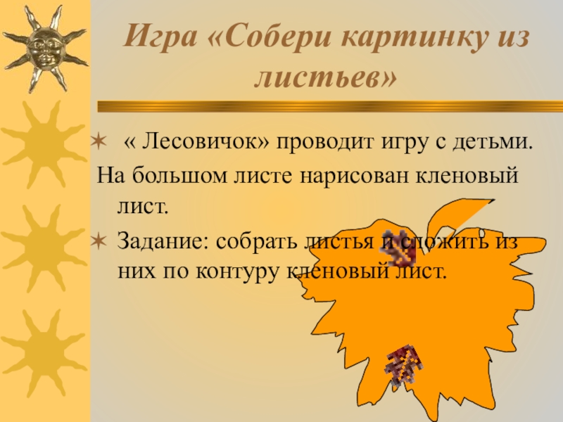 Игра «Собери картинку из листьев» « Лесовичок» проводит игру с детьми.На большом листе нарисован кленовый лист.Задание: