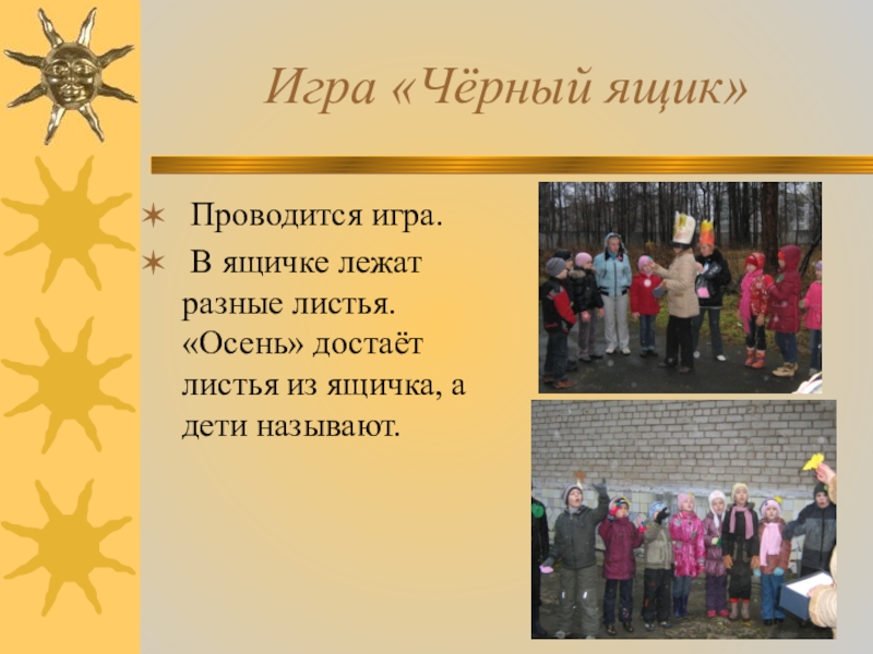 Игра «Чёрный ящик» Проводится игра. В ящичке лежат разные листья. «Осень» достаёт листья из ящичка, а дети