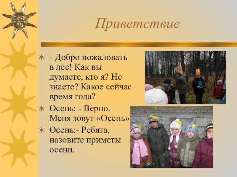 Приветствие- Добро пожаловать в лес! Как вы думаете, кто я? Не знаете? Какое сейчас время года?Осень: -