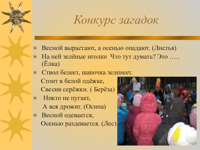 Конкурс загадокВесной вырастают, а осенью опадают. (Листья)На ней зелёные иголки Что тут думать? Это ….. (Ёлка)Ствол белеет,