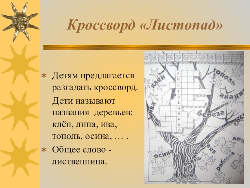 Кроссворд «Листопад»Детям предлагается разгадать кроссворд.  Дети называют названия деревьев: клён, липа, ива, тополь, осина, … .Общее