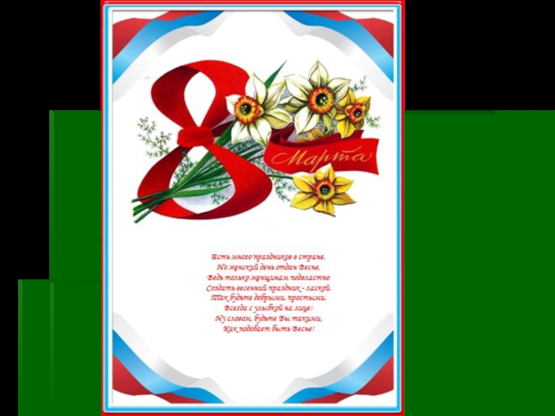 мы всегда поздравляем наших мам, бабушек, которые так много времени уделяют нашему воспитанию, а также сестричек и знакомых девочек. В этот день папы поздравляют своих жён и мам, дарят им цветы. А ты можешь сделать подарок своими руками — цветочек из бумаги, открытку, рисунок. Маме и бабушке понравится всё, что ты подаришь от чистого сердца.