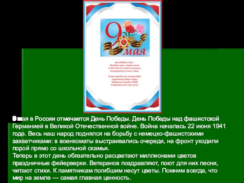 Слайд 179 мая в России отмечается День Победы. День Победы над фашистской