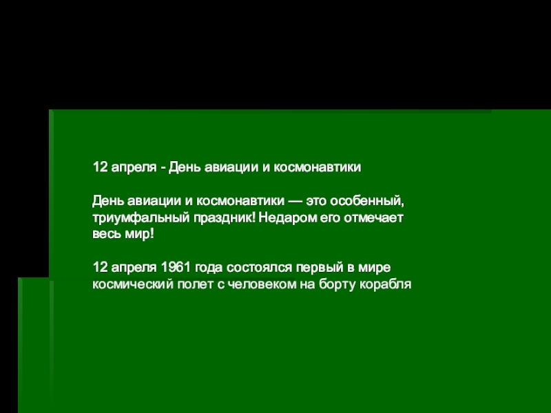12 апреля 1961 года состоялся первый в мире космический полет с человеком на борту корабля