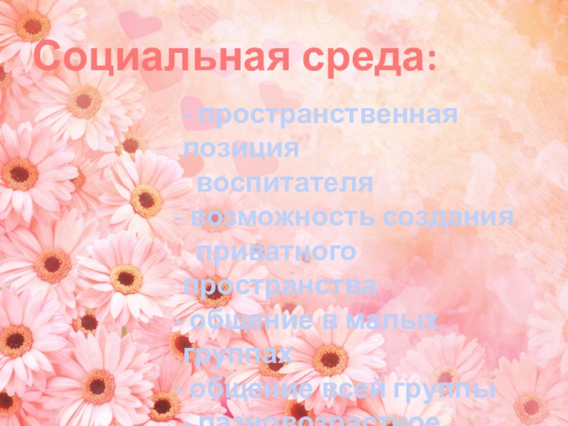 Социальная среда:- пространственная позиция воспитателя возможность создания приватного пространства общение в малых группах общение всей группы- разновозрастное