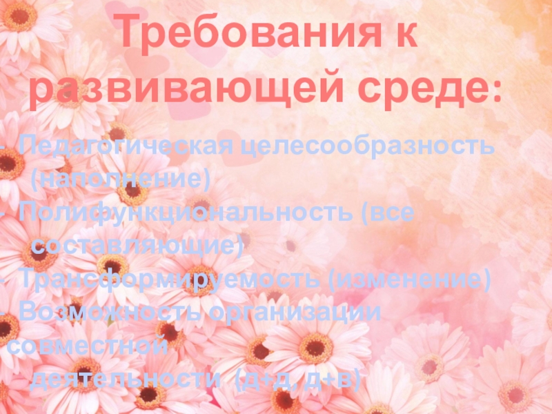Требования к развивающей среде: Педагогическая целесообразность (наполнение) Полифункциональность (все составляющие) Трансформируемость (изменение) Возможность организации совместной деятельности (д+д, д+в)