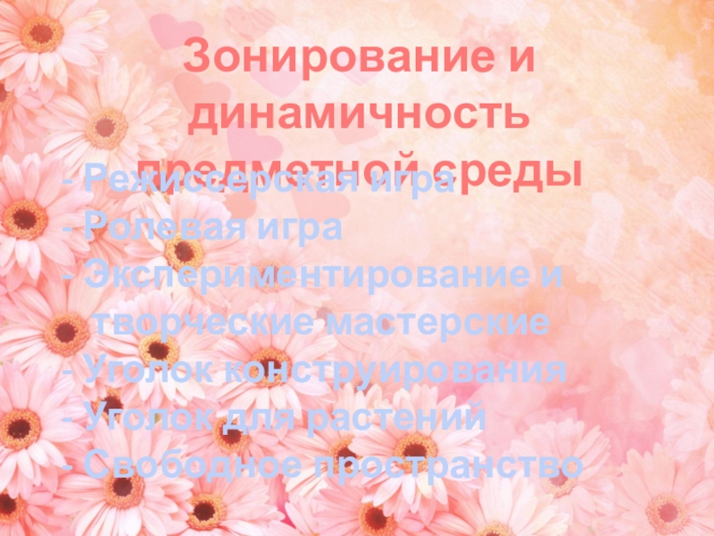 Зонирование и динамичностьпредметной среды Режиссерская игра Ролевая игра Экспериментирование и  творческие мастерские Уголок конструирования Уголок для