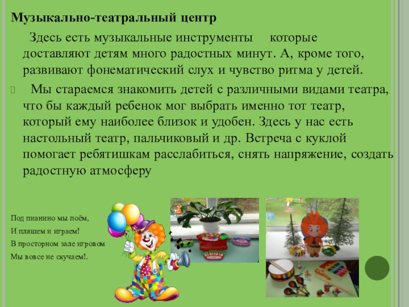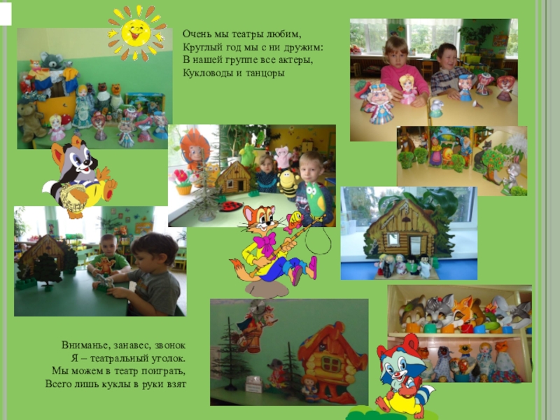 Мы стараемся знакомить детей с различными видами театра, что бы каждый ребенок мог выбрать именно тот театр, который ему наиболее близок и удобен. Здесь у нас есть настольный театр, пальчиковый и др. Встреча с куклой помогает ребятишкам расслабиться, снять напряжение, создать радостную атмосферу