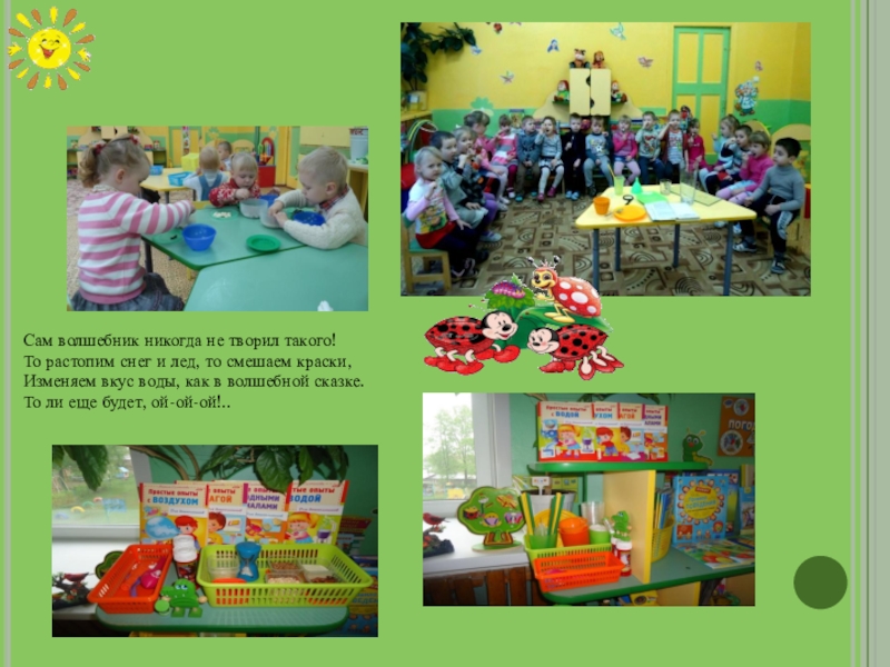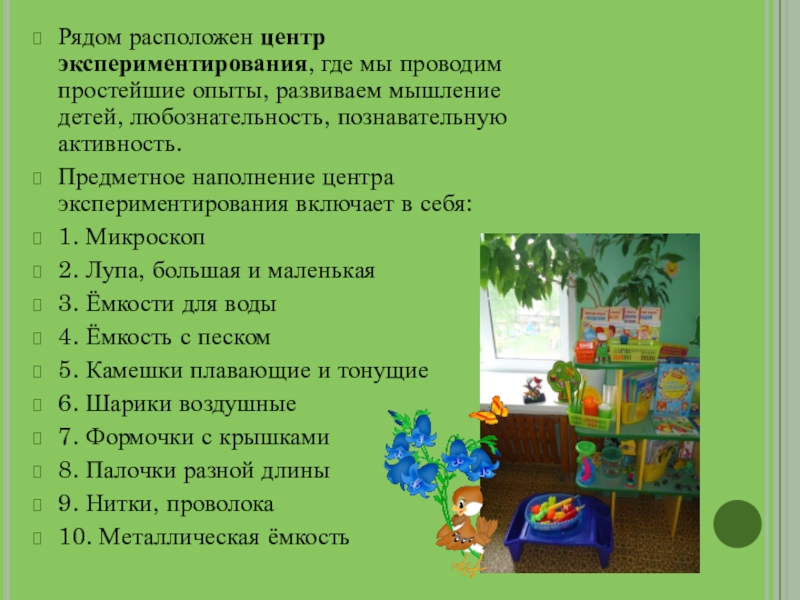 Слайд 20Рядом расположен центр экспериментирования, где мы проводим простейшие опыты, развиваем мышление
