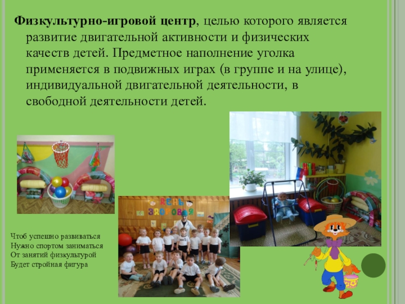 Слайд 8Физкультурно-игровой центр, целью которого является развитие двигательной активности и физических качеств