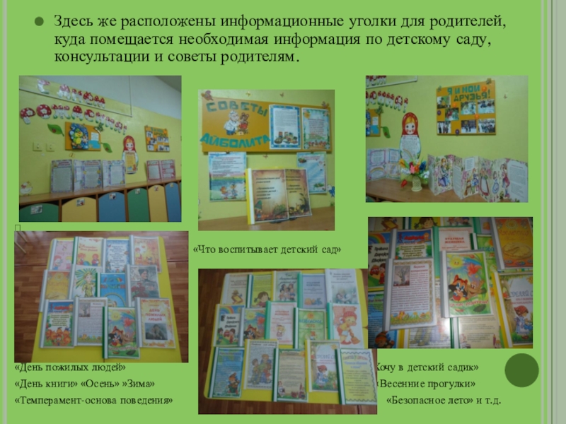Слайд 5Здесь же расположены информационные уголки для родителей, куда помещается необходимая информация