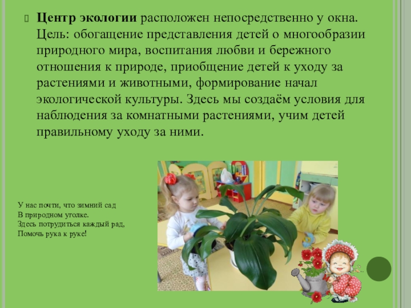 Слайд 29В бытовой зоне располагается уголок дежурства. Цель: формирование умения выполнять обязанности