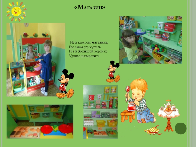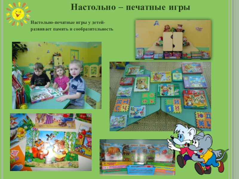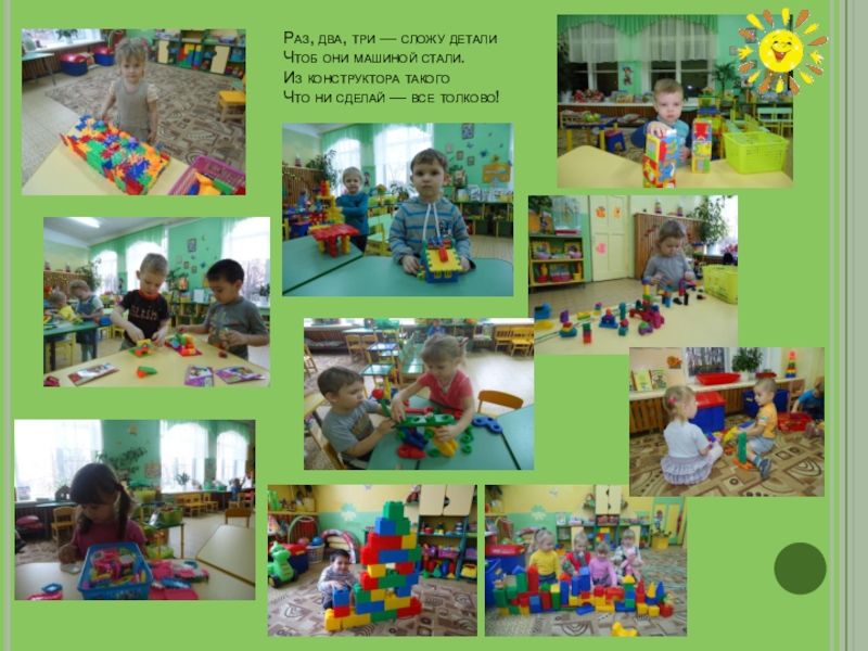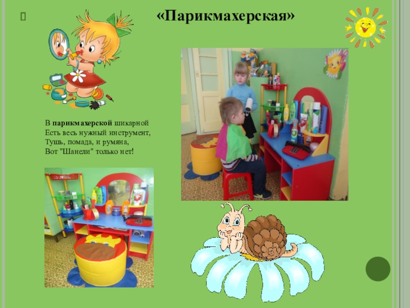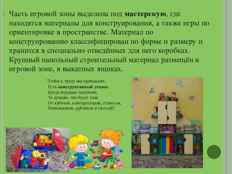 Слайд 22Часть игровой зоны выделена под мастерскую, где находятся материалы для конструирования,