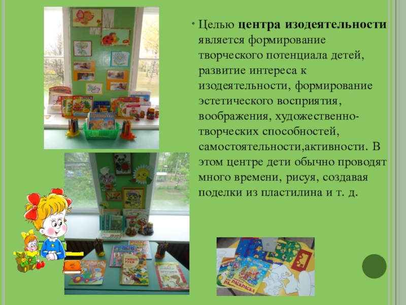 изодеятельности, формирование эстетического восприятия, воображения, художественно-творческих способностей, самостоятельности,активности. В этом центре дети обычно проводят много времени, рисуя, создавая поделки из пластилина и т. д.