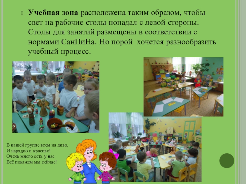 Слайд 7Учебная зона расположена таким образом, чтобы свет на рабочие столы попадал