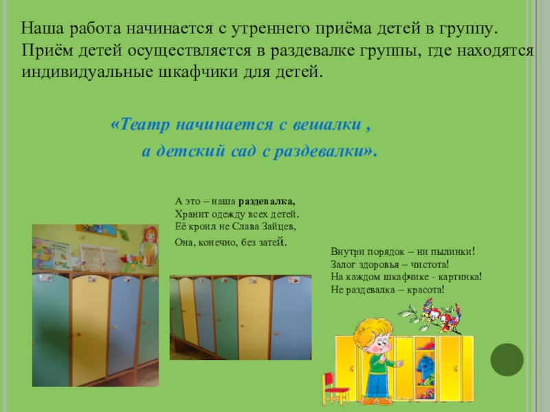 Приём детей осуществляется в раздевалке группы, где находятся индивидуальные шкафчики для детей.