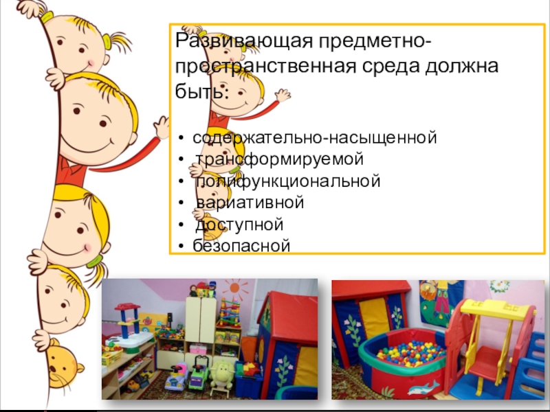 Развивающая предметно-пространственная среда должна быть: содержательно-насыщенной трансформируемой полифункциональной вариативнойдоступнойбезопасной