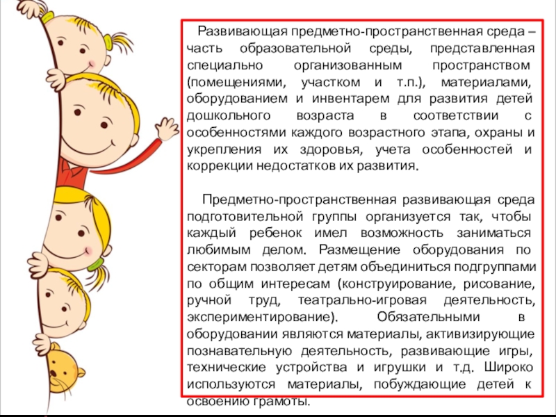 Развивающая предметно-пространственная среда – часть образовательной среды, представленная специально организованным пространством (помещениями, участком и т.п.), материалами, оборудованием и инвентарем для развития детей дошкольного возраста в соответствии с особенностями каждого возрастного этапа, охраны и укрепления