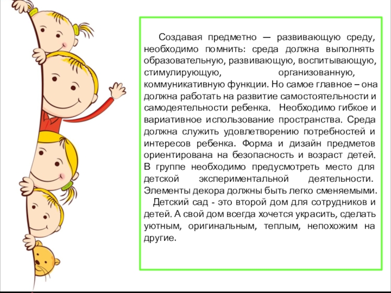 выполнять образовательную, развивающую, воспитывающую, стимулирующую, организованную, коммуникативную функции. Но самое главное – она должна работать на развитие самостоятельности и самодеятельности ребенка. Необходимо гибкое и вариативное использование пространства. Среда должна служить удовлетворению потребностей и интересов ребенка. Форма и дизайн предметов ориентирована на безопасность и возраст детей. В группе необходимо предусмотреть место для детской экспериментальной деятельности. Элементы декора должны быть легко сменяемыми.