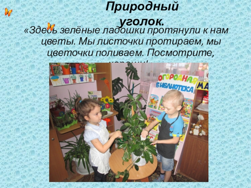 Слайд 14«Здесь зелёные ладошки протянули к нам цветы. Мы листочки протираем, мы