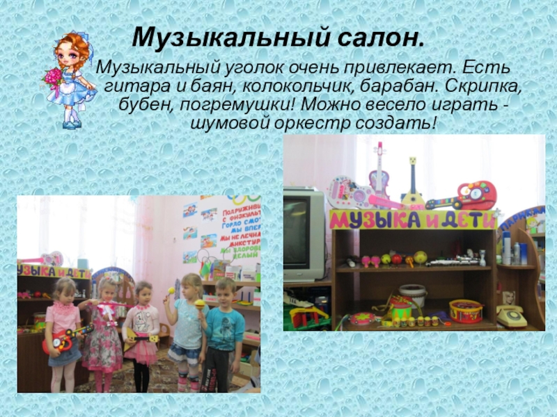Музыкальный уголок очень привлекает. Есть гитара и баян, колокольчик, барабан.