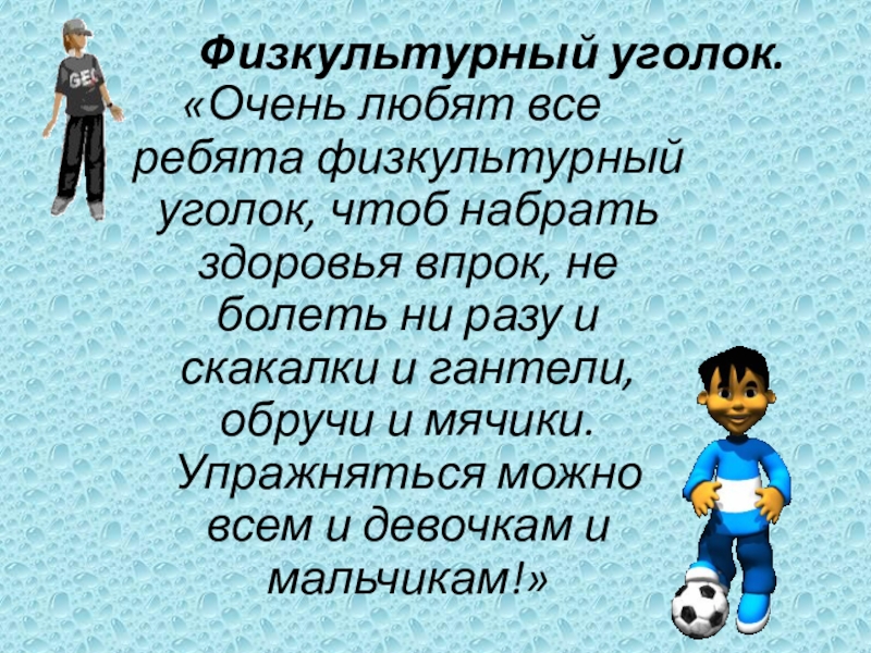«Очень любят все ребята физкультурный уголок, чтоб набрать здоровья впрок,